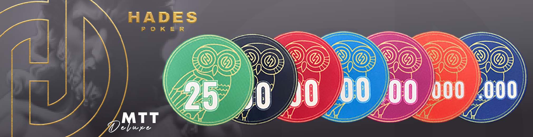 The MTT Deluxe is a full color printed ceramic chip, weighing 10 grams. Ceramic chips are known for their luxurious look and casino feel, to which the chosen colors of these chips contribute. The design of the chip features the owl of Athens, inspired by Charon's coins from ancient Greece. Also this set consists of the denominations 25, 100, 500, 1000, 5000, 25,000 and is expandable with the 100,000 chip.