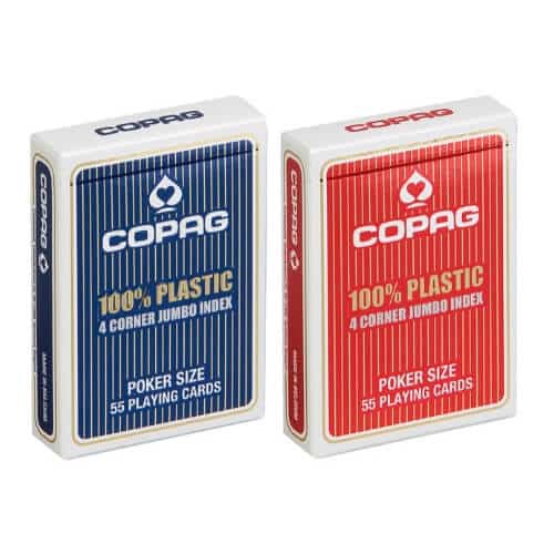 COPAG poker playing cards are used by casinos worldwide because they are professional poker cards, they are one of the best playing cards available on the market today. The COPAG poker playing cards have a jumbo 2 index. The set contains 12 packs of COPAG cards, 6x red and 6x blau.