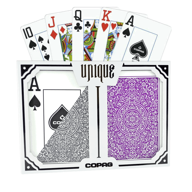 - 2 packs Copag Unique playing cards (purple and black)