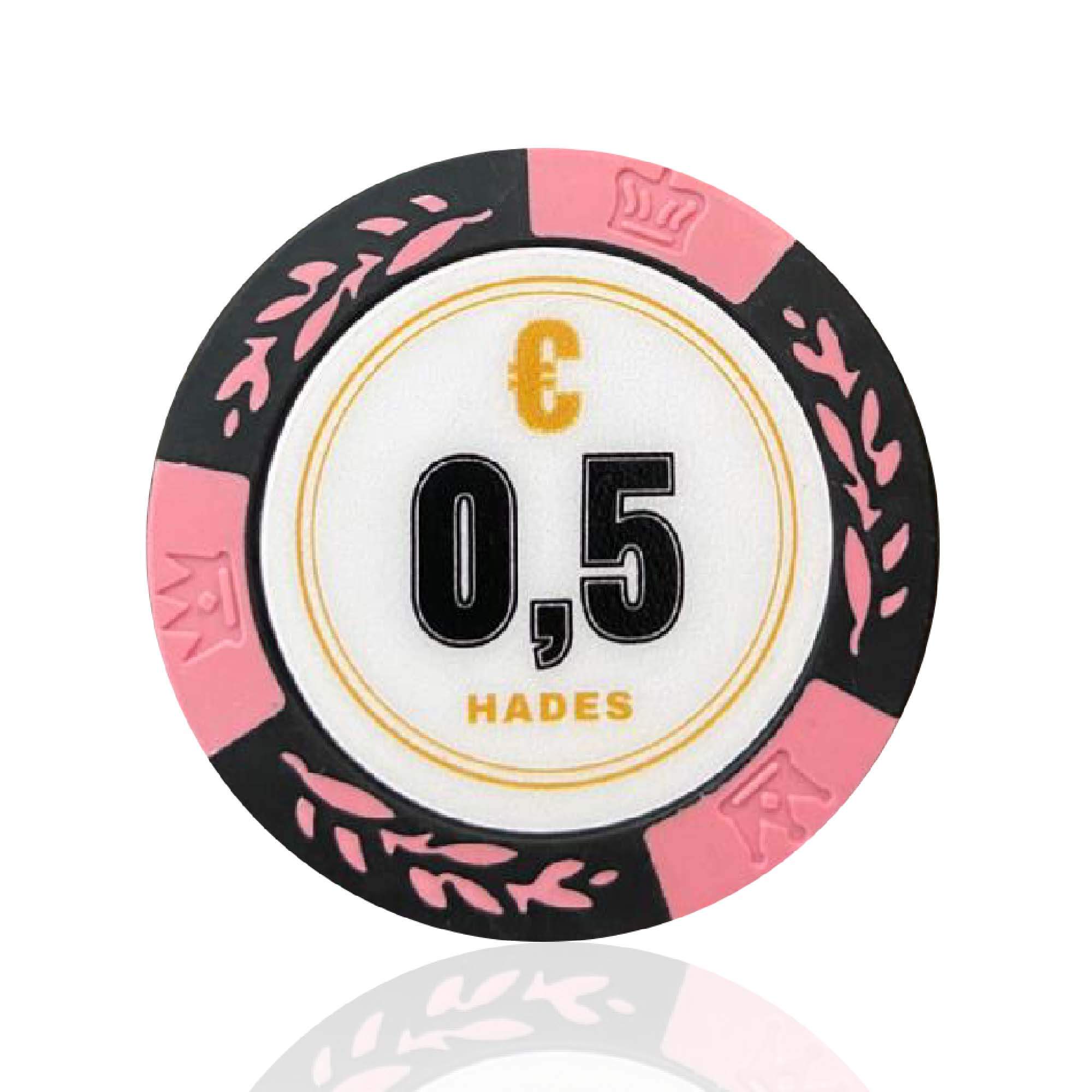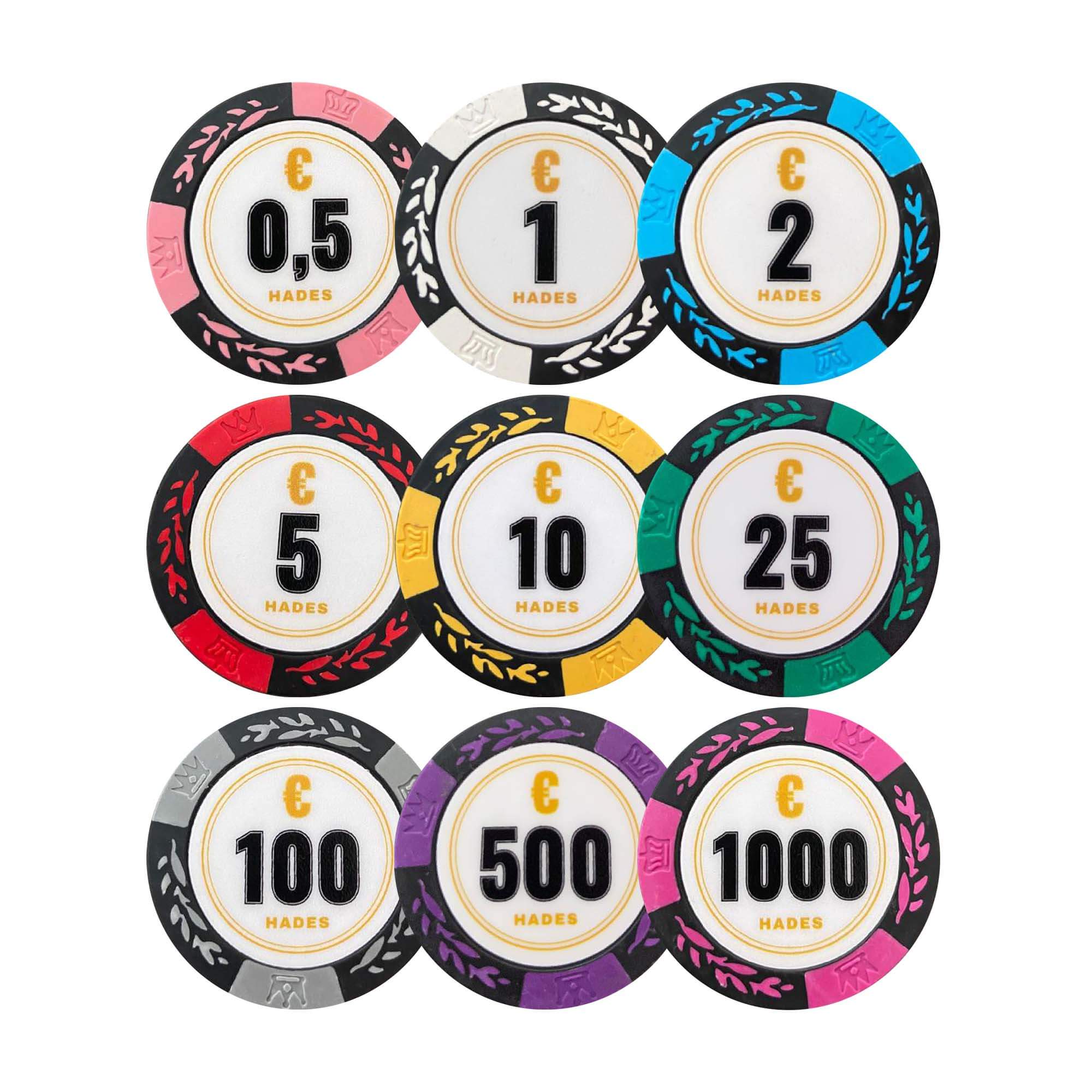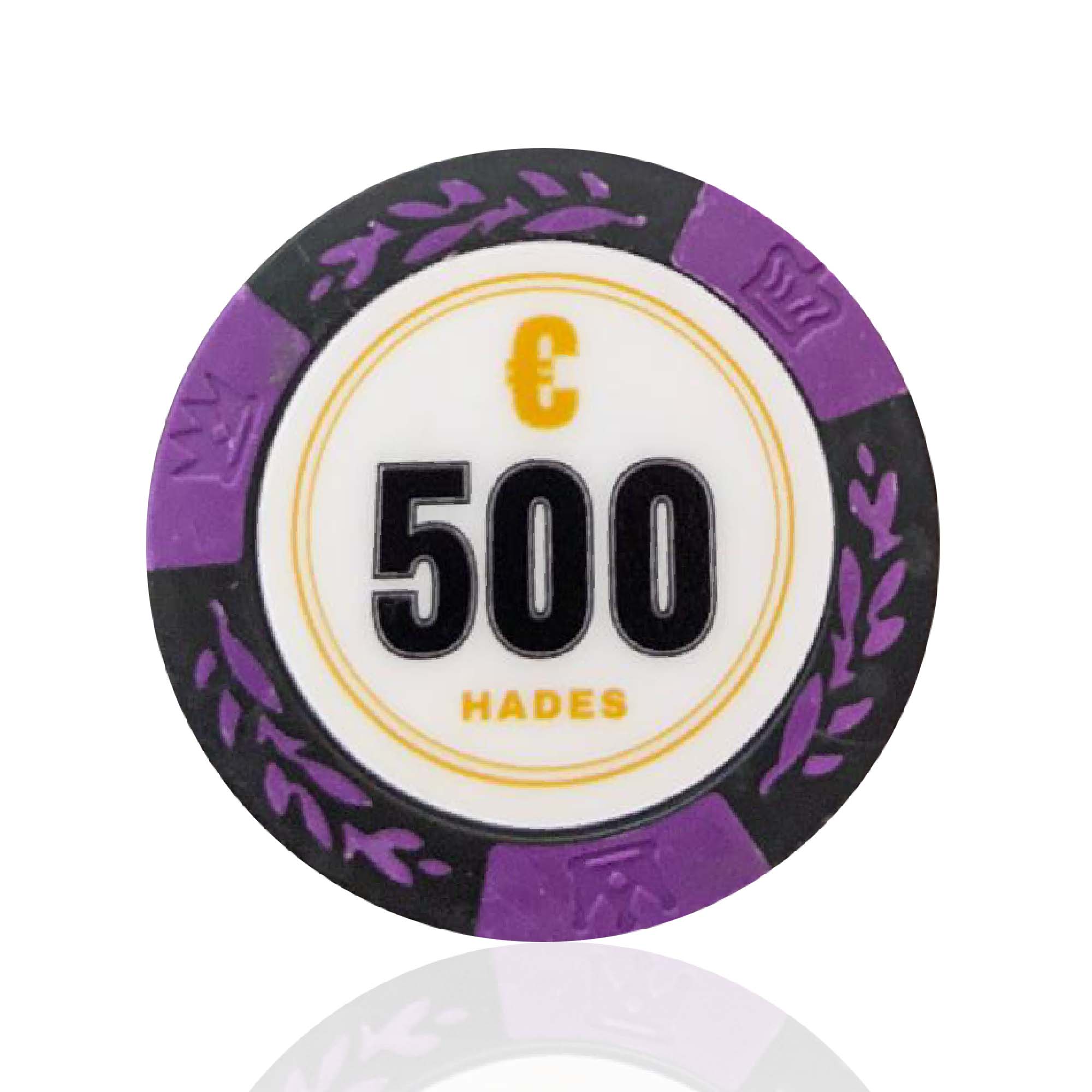 The Cashgame Classic is a chipset suitable for cash games in euros, with denominations from €0.50 to €500. The Cashgame Classic series consists of high-quality clay composite chips, weighing 14 grams. Read more about the Hades Poker chips