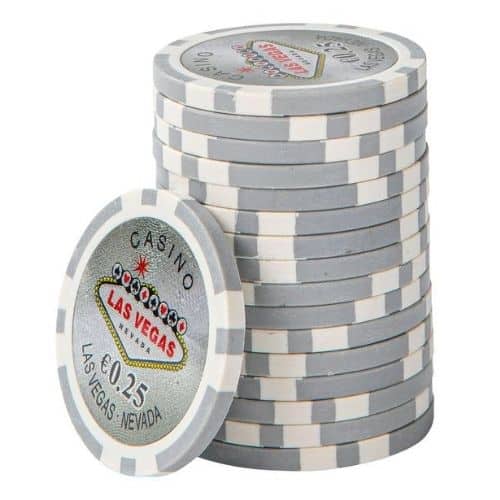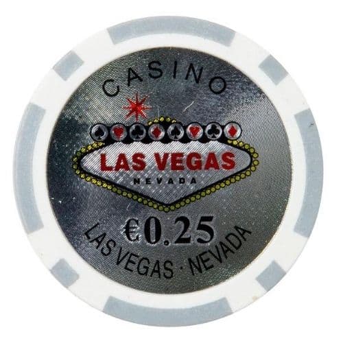 Las Vegas chips €0.25. These chips are available in €0.25, €0.50, €1, €5, €25, €100 and €500 denomination. The chips are made of ABS and are great for cash game nights.