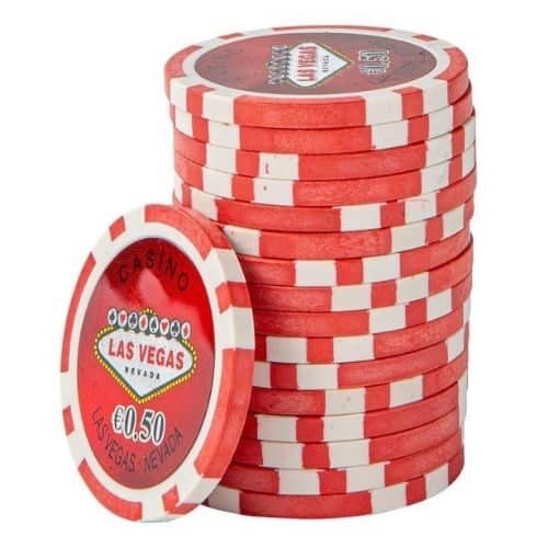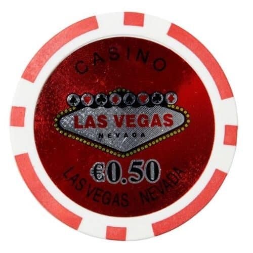 Las Vegas chips €0.50. These chips are available in €0.25, €0.50, €1, €5, €25, €100 and €500 denomination. The chips are made of ABS and are perfect for cash game nights.