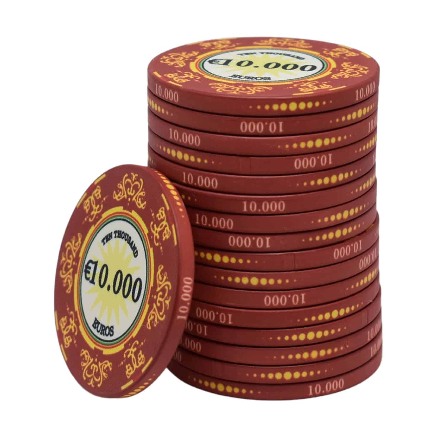 Macau deluxe Keramik Chips €10.000,-. These chips are available in €0.25, €0.50, €1, €5, €25, €100, €500, €1,000, €5,000 and €10,000. The chips are made of ceramic and are great for both tournament and cash game nights.