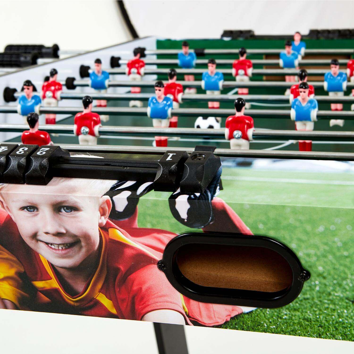 This soccer table is 90cm long and has a print as shown in the pictures. Thanks to the sturdy table legs, the table is very stable.